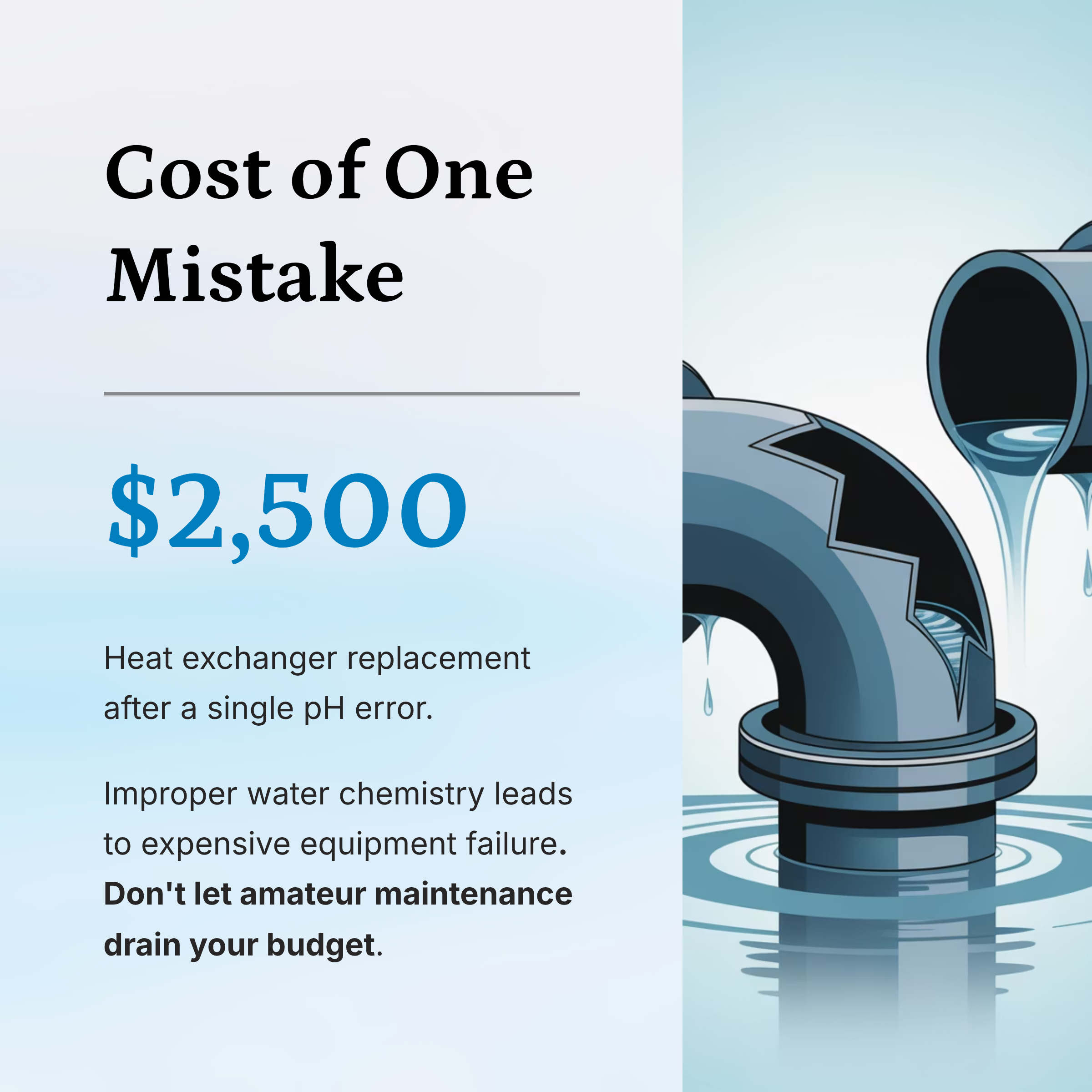 The Hidden Risk: A single mistake allowing pH to drop too low can destroy a heater exchanger worth $2,500. A neglected algae bloom can cost $500 in chemicals and days to clear.
