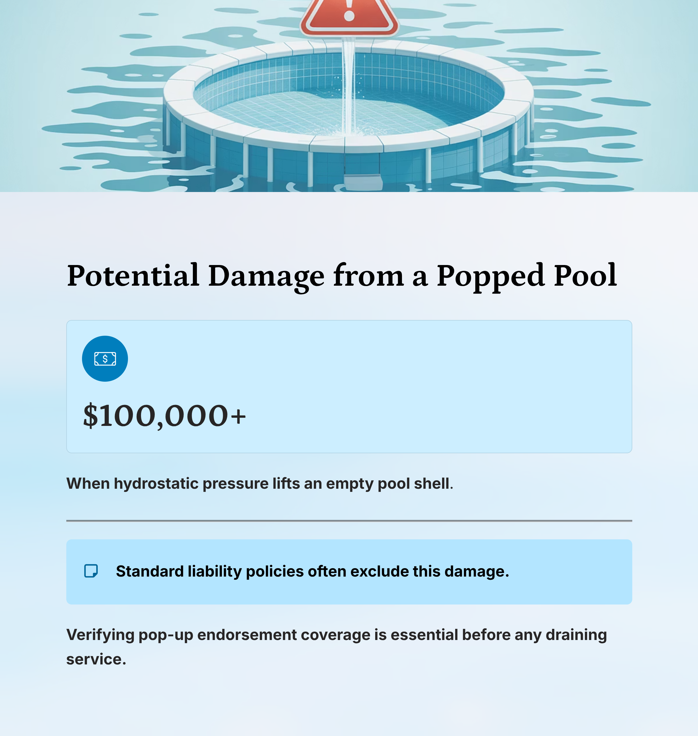 The Problem: Standard GL policies often exclude “subsidence” or “earth movement.” Insurers may deny claims for popped pools under this exclusion.
