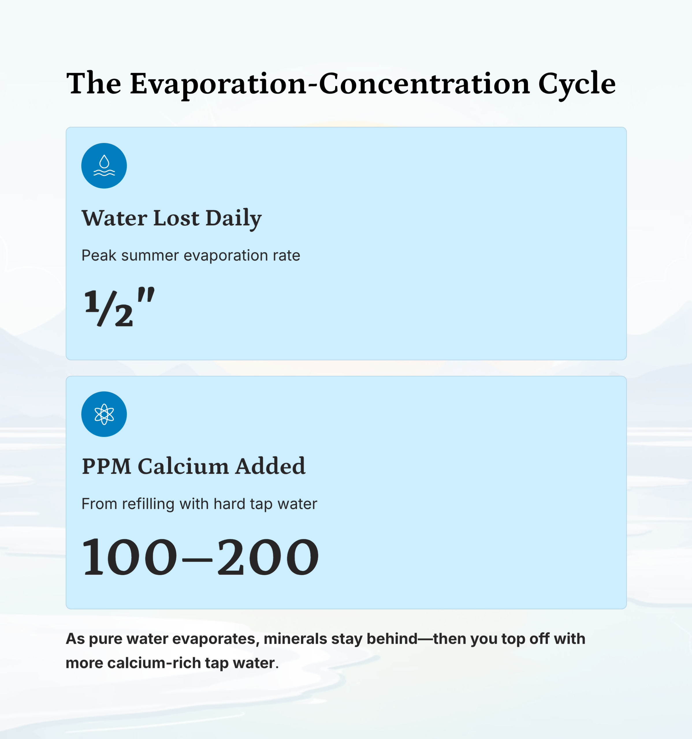 An uncovered Austin pool can lose 1/4 to 1/2 inch of water daily during summer, according to Alliance Pools and Patio. As pure water evaporates, it leaves minerals behind. You then top off with more calcium-rich tap water. This cycle can increase calcium hardness by 100-200 ppm per season.
